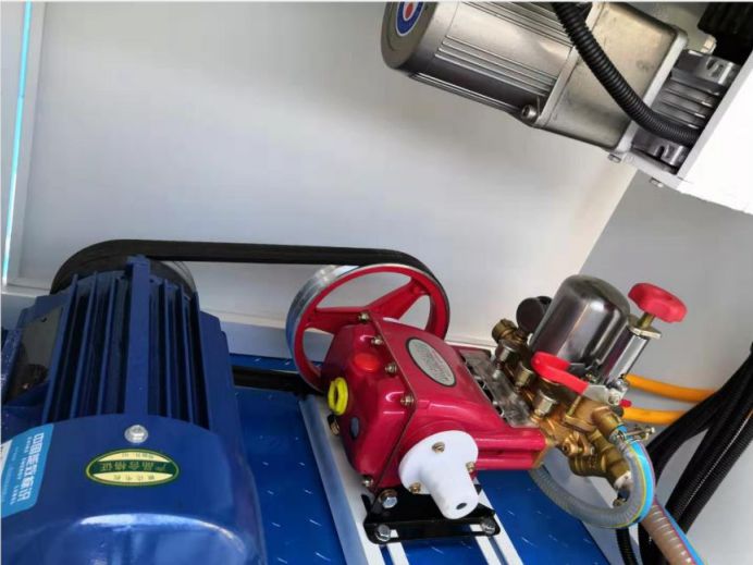噴霧抑塵車隨車裝配大功率柴油機、三相交流同步發電機、三相異步電動機、三缸活塞泵,并安裝風機風炮,為農藥噴灑提供專一動力來源和專用設備。灑水泵可抽水排水,安裝濾網,帶消防接口,可通過消防栓進水,帶自流閥,隨車選裝20米噴藥綠化卷盤