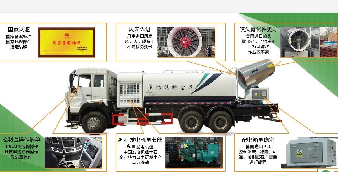 重汽8方多功能抑塵車,噴霧抑塵車又稱:多功能抑塵車、降塵車、霧炮車、空氣凈化車。主要是在灑水車的基礎(chǔ)上,增加了遠(yuǎn)距離噴霧抑塵系統(tǒng),對(duì)治理工業(yè)粉塵污染、汽車尾氣、秸稈燃燒等產(chǎn)生在空氣中的細(xì)小懸浮顆粒有顯著的效果,被人們成為“治霾神器”。多功能抑塵車主要作用是噴霧抑塵,同時(shí)具備灑水和道路沖洗功能,還可進(jìn)行工地降塵、環(huán)保除塵、空氣凈化等作業(yè)。風(fēng)送式噴霧大炮可達(dá)30-120米不等,霧炮筒可360°旋轉(zhuǎn),可遙控操作。操控方便,移動(dòng)靈活。