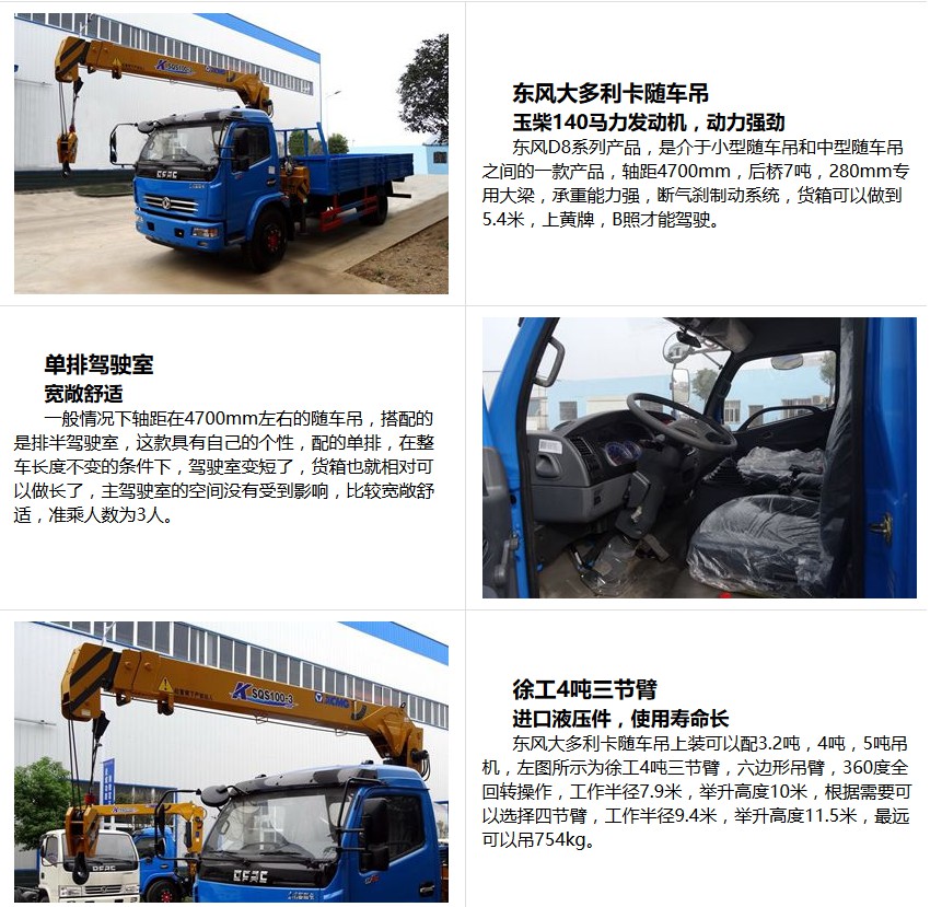 隨車起重運輸車,是一種通過液壓舉升及伸縮系統來實現貨物的升降、回轉、吊運的設備,通常裝配于載貨汽車上。一般由載貨汽車底盤、貨廂、取力器、吊機組成。載貨汽車底盤可選東風、解放、歐曼、斯太爾等各噸位。